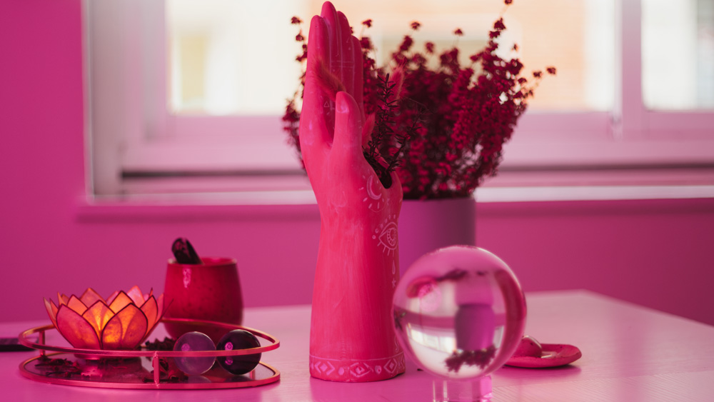 La luz tenue intensifica el carácter íntimo y mágico del espacio, ideal para sesiones de lectura de cartas astrales, interpretación de horóscopos y consultas personalizadas.